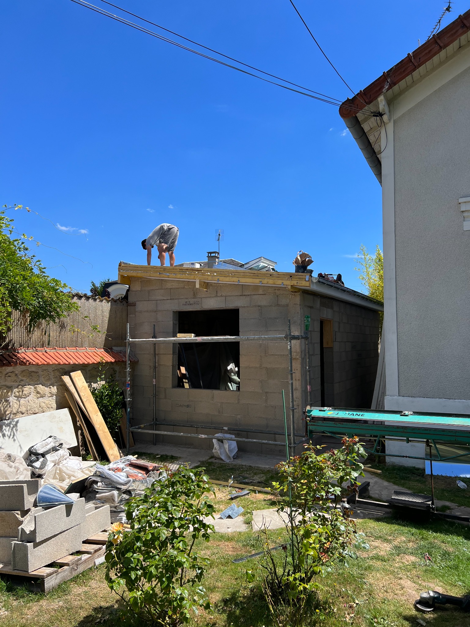 Après l’élévation des murs, la toiture a été installée, assurant une bonne étanchéité tout en respectant l’harmonie esthétique du bâtiment principal.