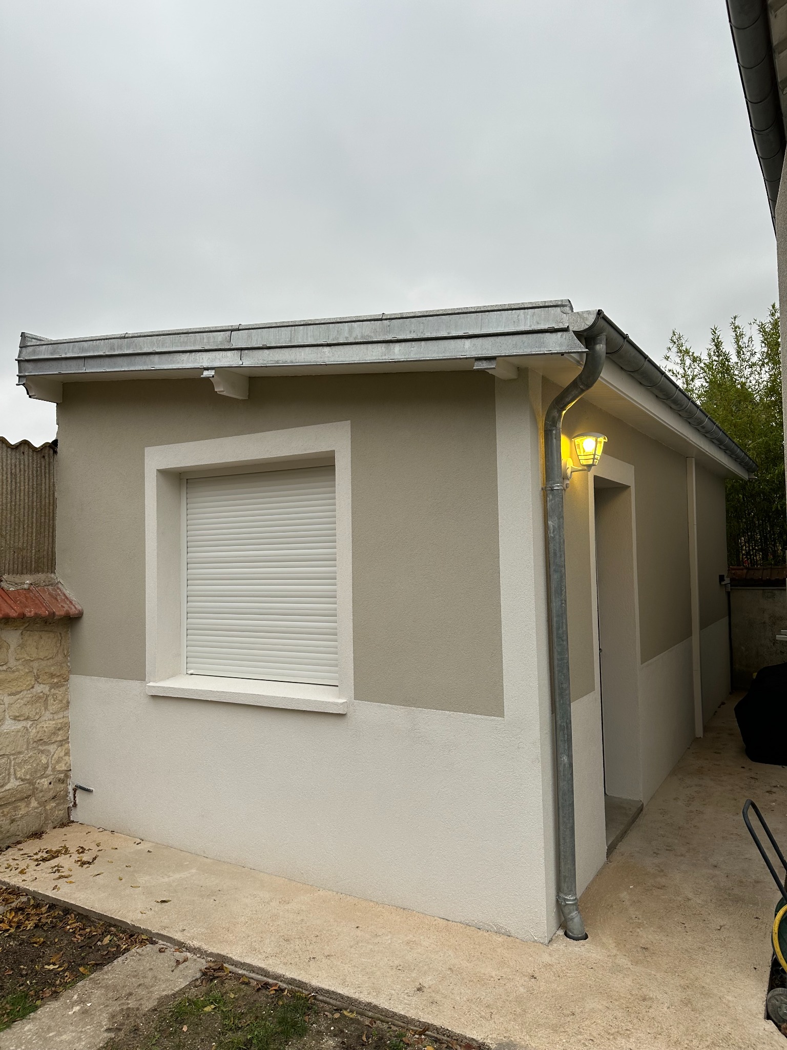 Une fois la couverture posée, un enduit a été appliqué sur les façades, combinant esthétique et protection, avec des finitions propres et soignées.