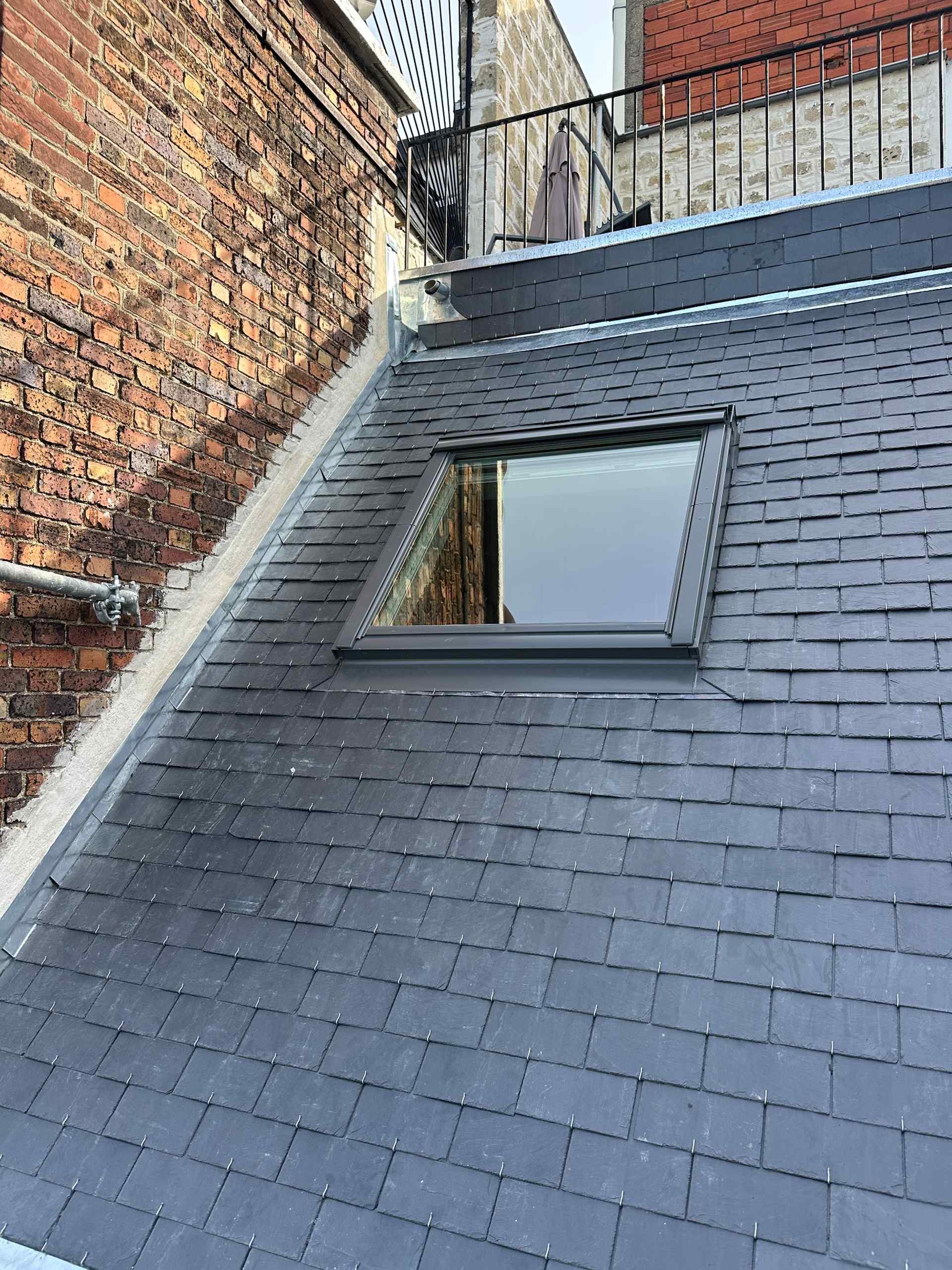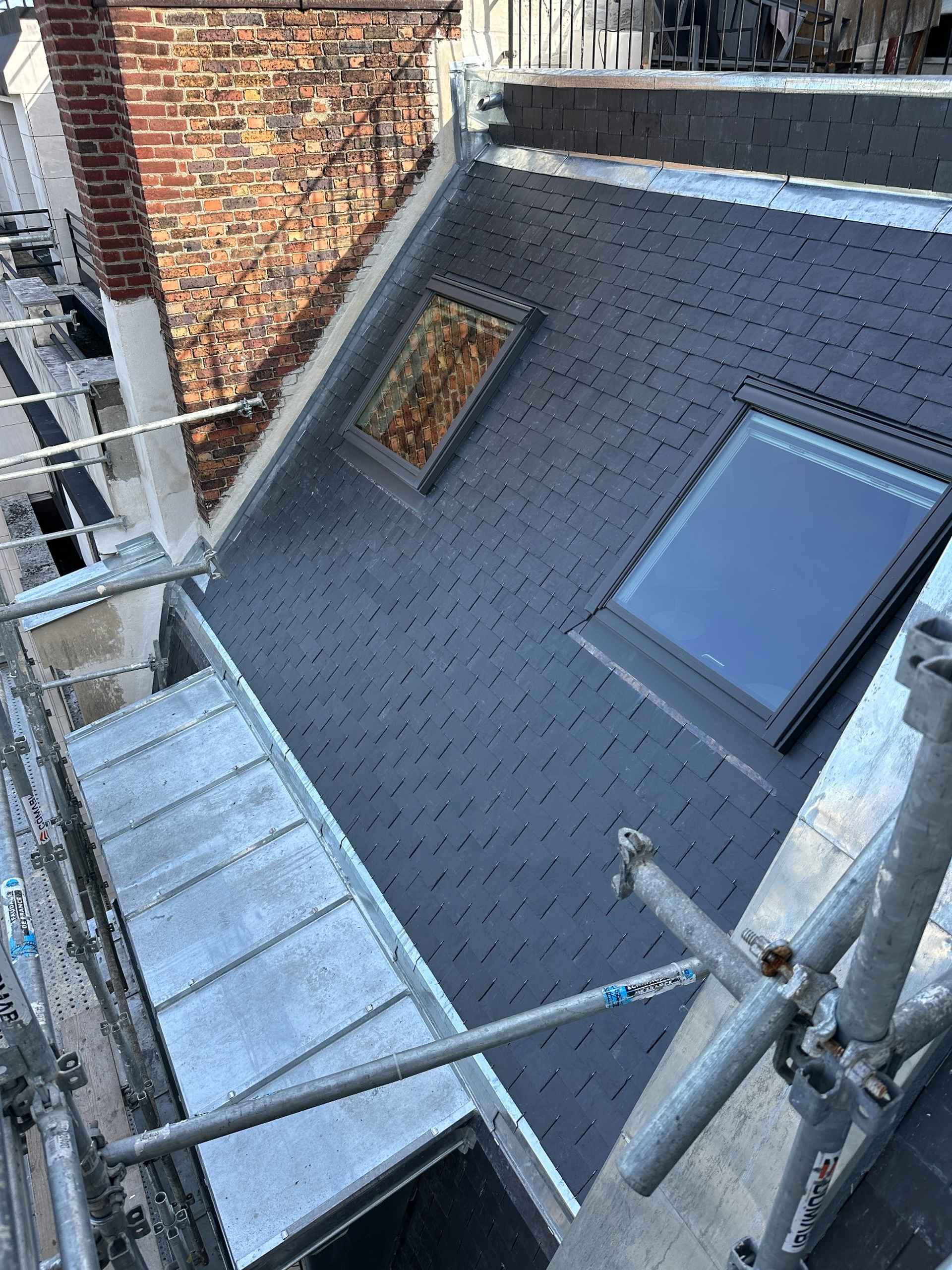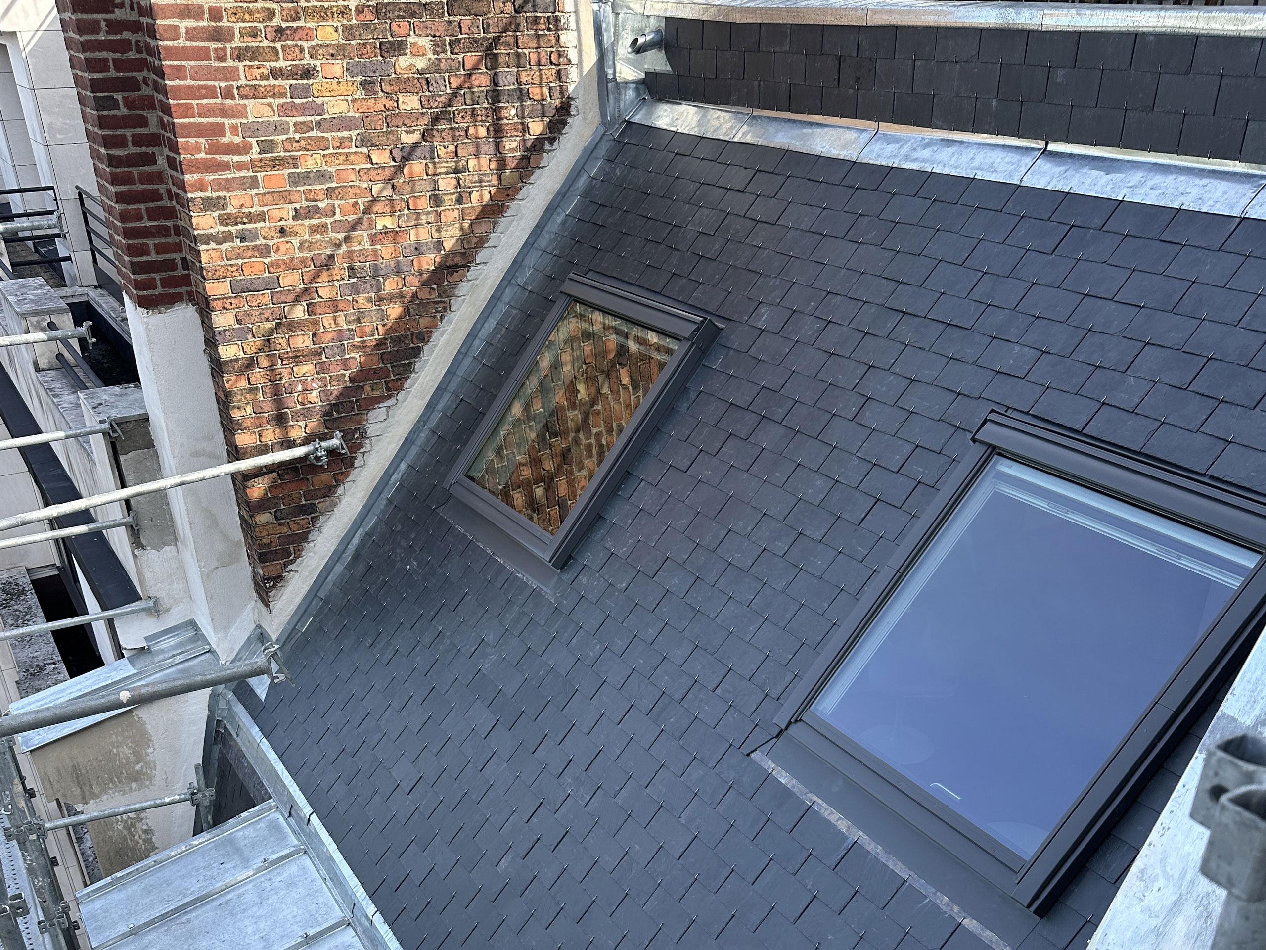 Une nouvelle couverture en ardoise naturelle a été posée, conformément aux règles de l’art, avec un travail soigné sur les rives, arêtiers et faîtages. La zinguerie a été entièrement refaite : gouttières, noues et couvertines en zinc ont été façonnées sur mesure et soudées pour assurer une parfaite étanchéité dans le temps. Une attention particulière a été portée aux points singuliers, notamment autour des fenêtres de toit et du chéneau encaissé, afin de garantir la durabilité et la résistance aux intempéries.
