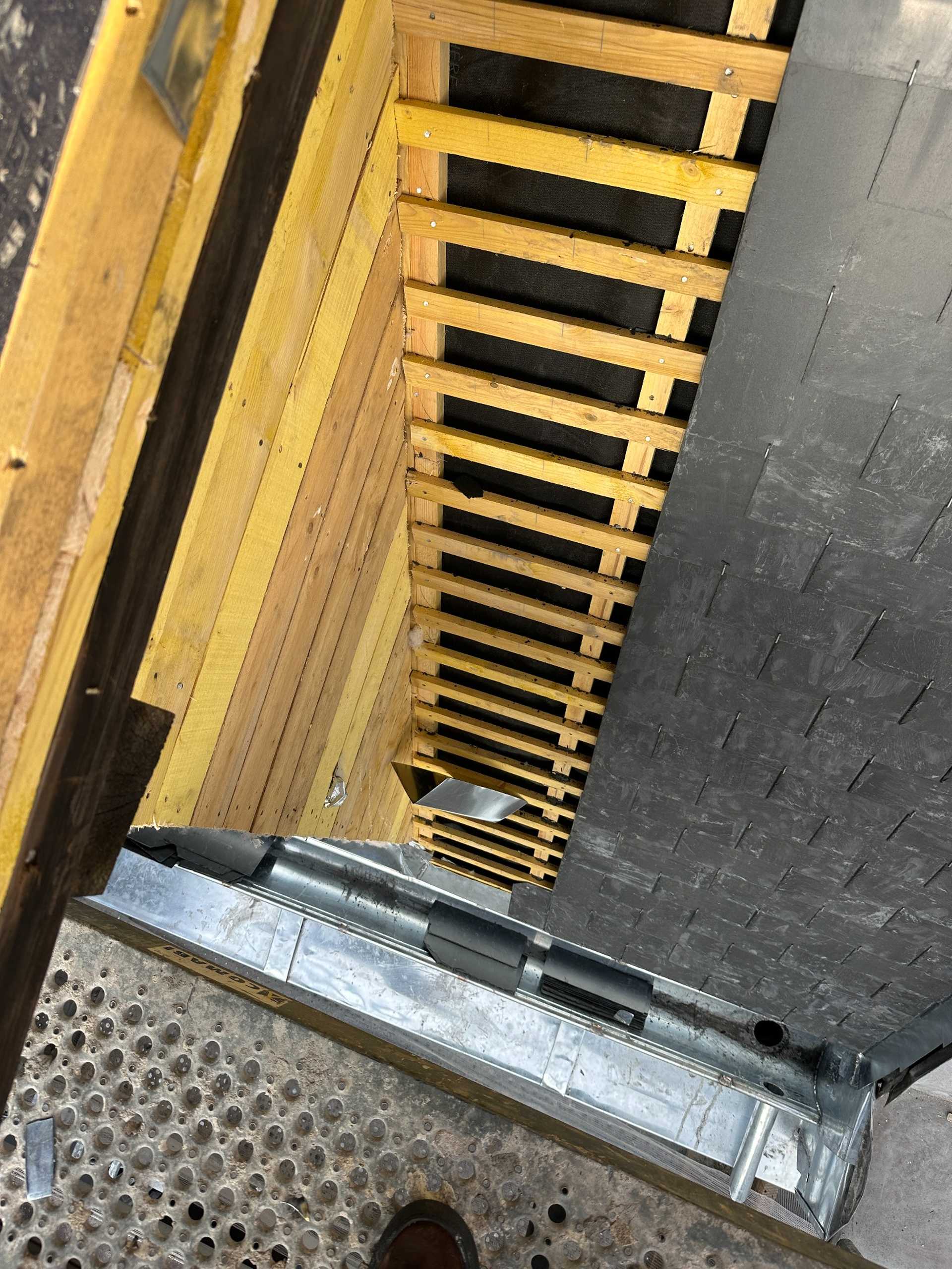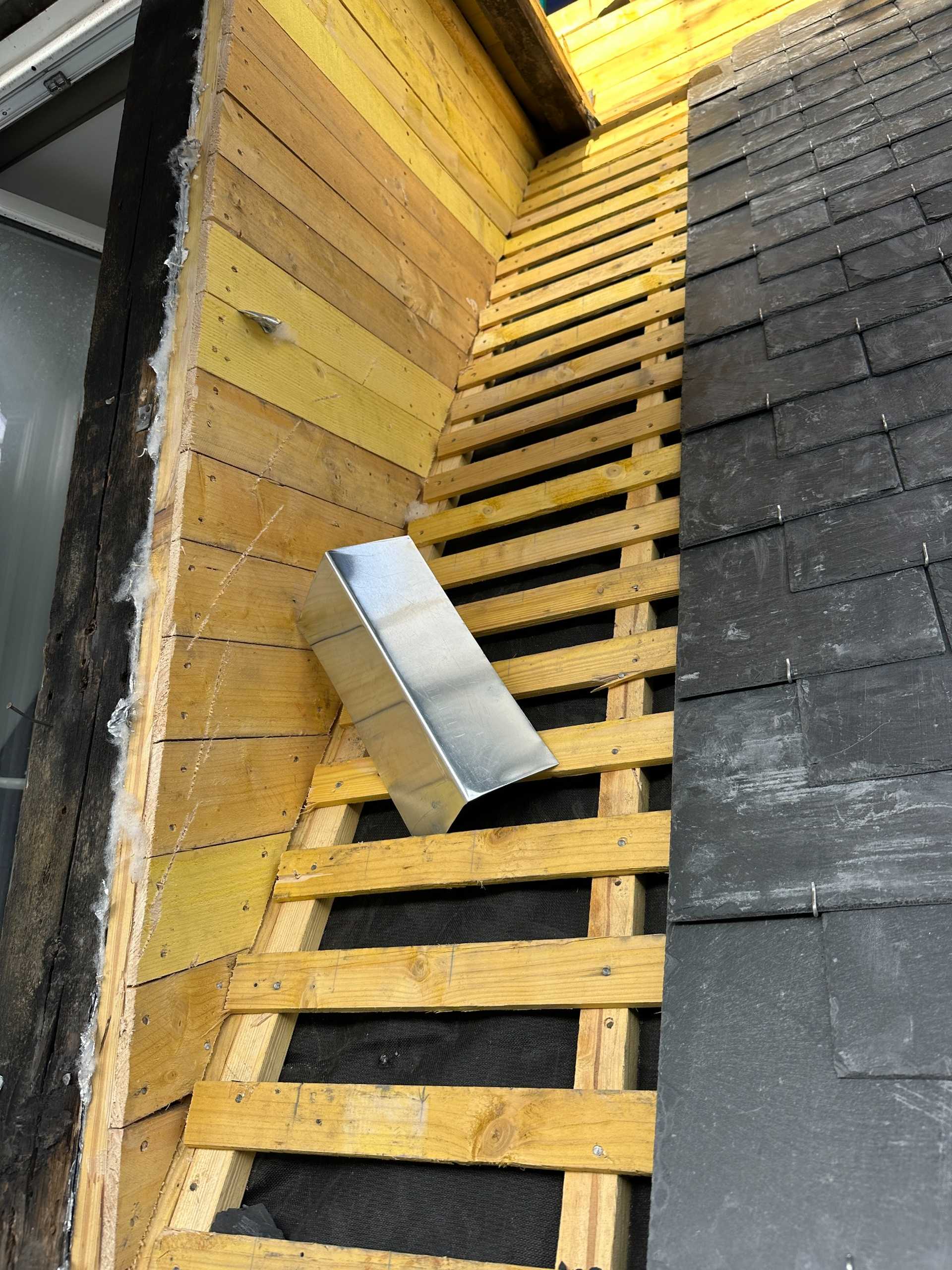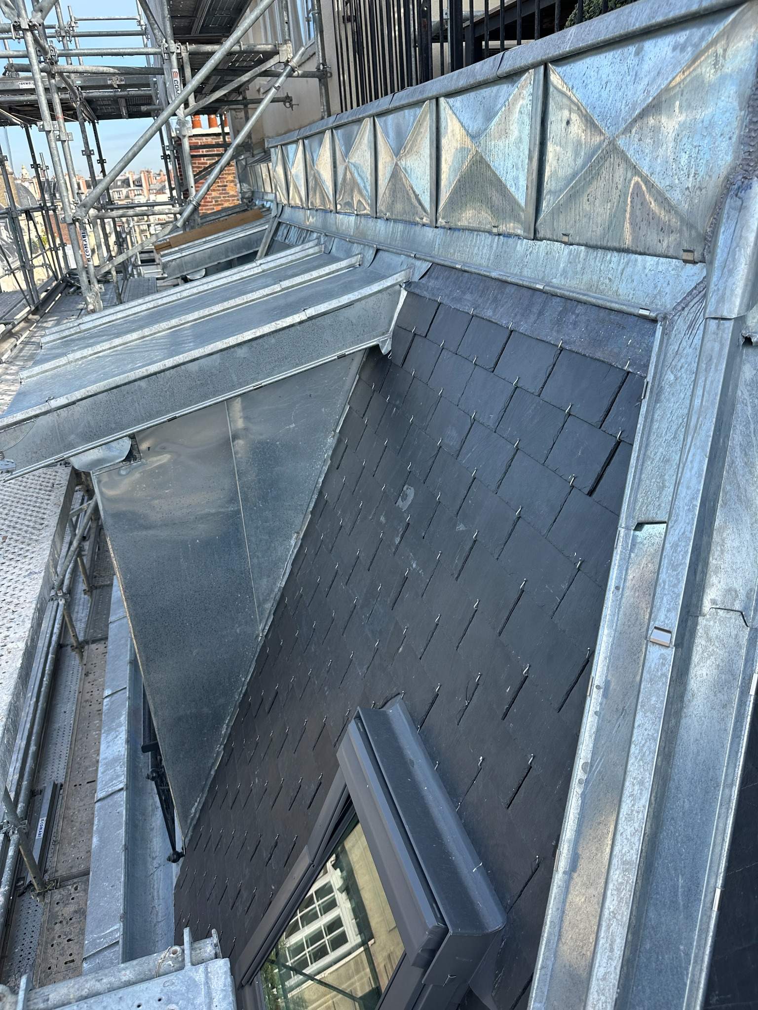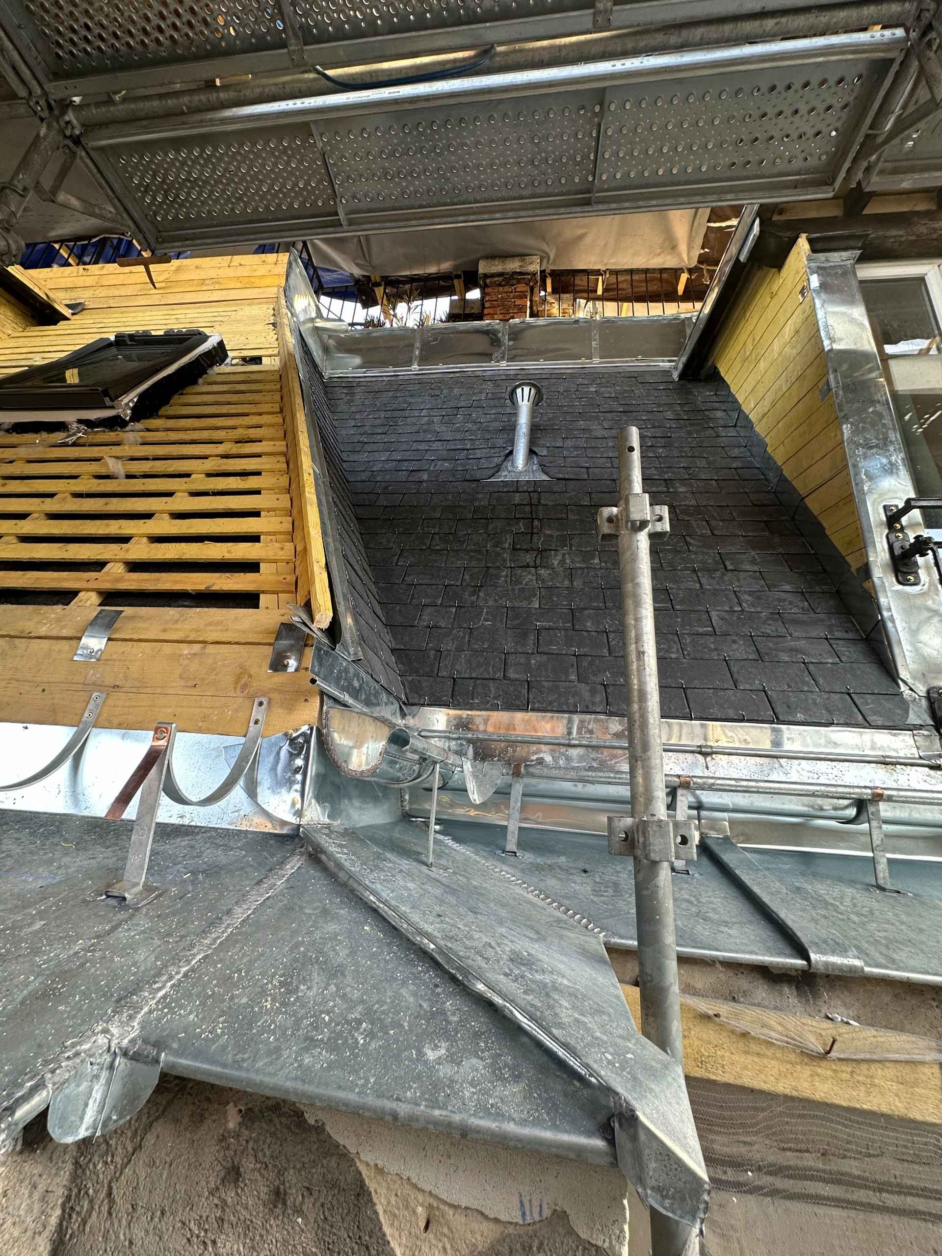 Une nouvelle couverture en ardoise naturelle a été posée, conformément aux règles de l’art, avec un travail soigné sur les rives, arêtiers et faîtages. La zinguerie a été entièrement refaite : gouttières, noues et couvertines en zinc ont été façonnées sur mesure et soudées pour assurer une parfaite étanchéité dans le temps. Une attention particulière a été portée aux points singuliers, notamment autour des fenêtres de toit et du chéneau encaissé, afin de garantir la durabilité et la résistance aux intempéries.