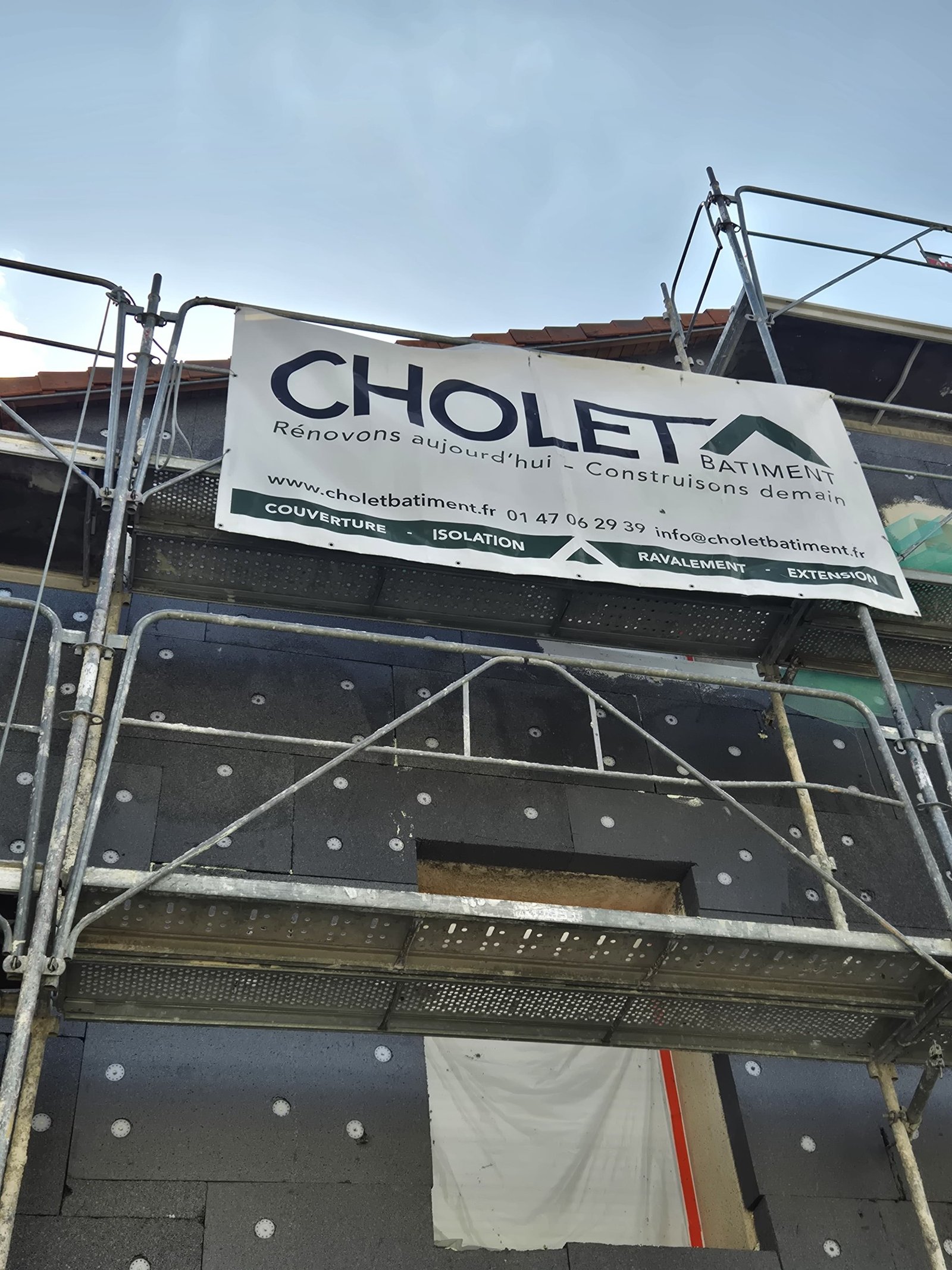 Après mise en place de l’échafaudage et préparation des supports, nous avons posé des panneaux isolants haute performance sur l’ensemble des murs extérieurs.
