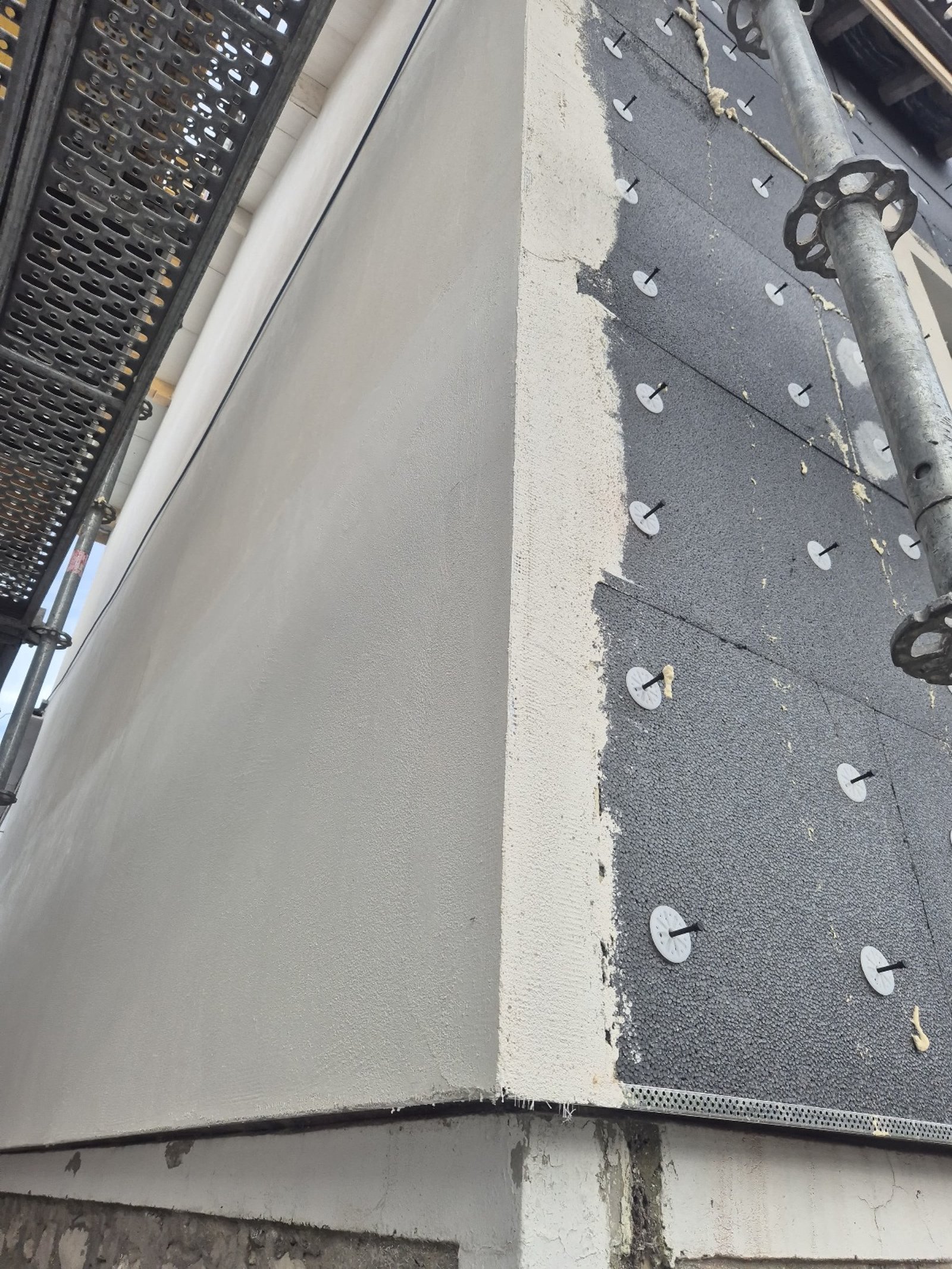 L’objectif était de renforcer la performance énergétique du bâtiment tout en lui apportant une esthétique soignée. Le chantier a commencé par la pose de panneaux isolants en polystyrène graphité fixés mécaniquement.
