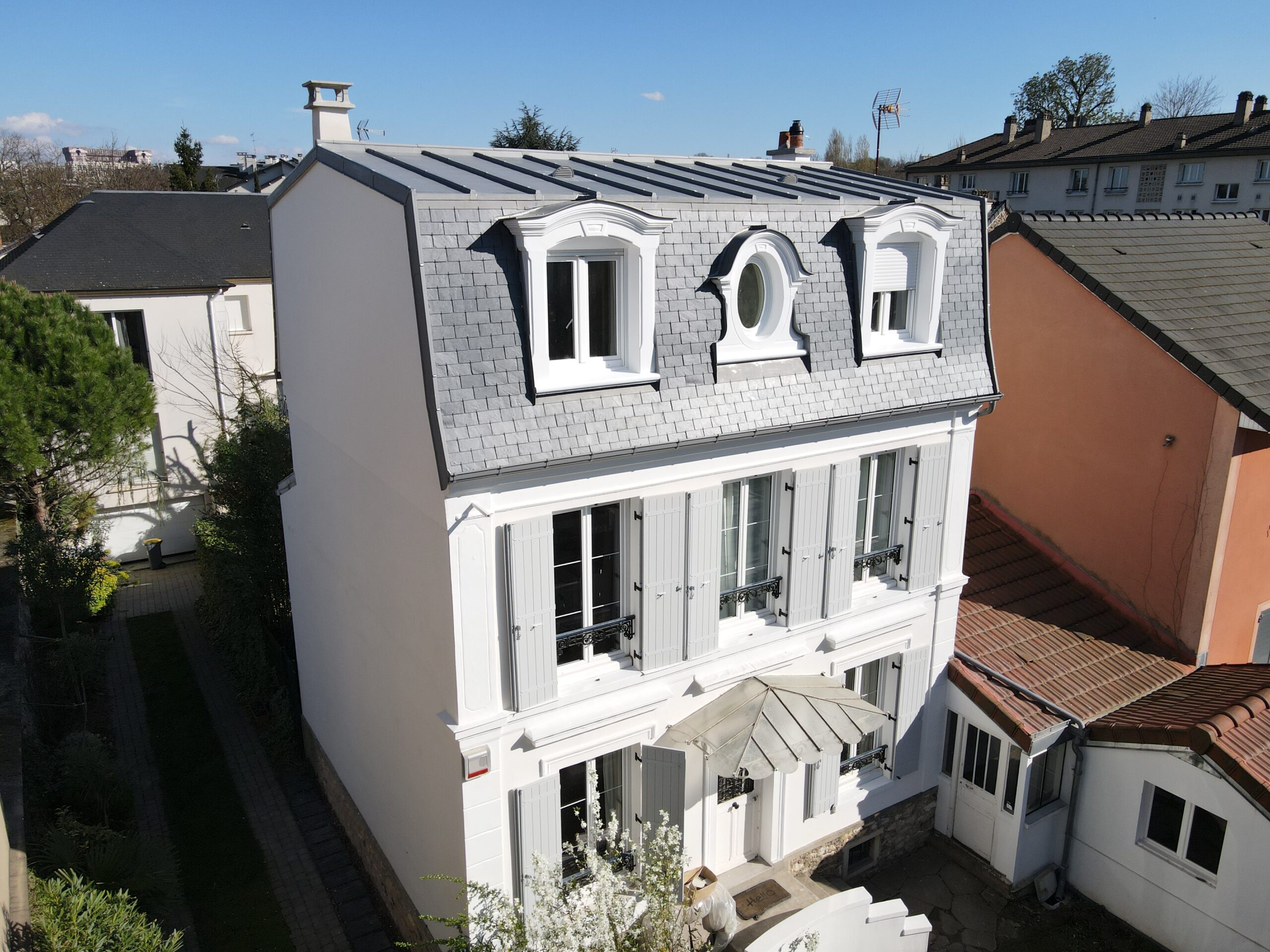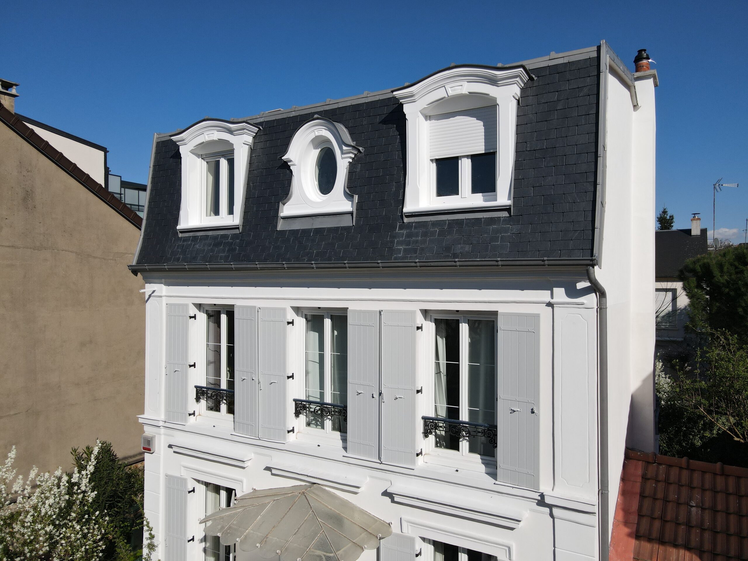 Initialement dotée d’un simple comble avec velux, elle a été rehaussée par une surélévation en toiture ardoise, intégrant trois superbes lucarnes maçonnées qui confèrent à la façade une élégance parisienne intemporelle. Les travaux ont nécessité une reprise complète de la charpente et de la couverture, avec l’installation d’une structure en bois massif et d’un pare-pluie performant.