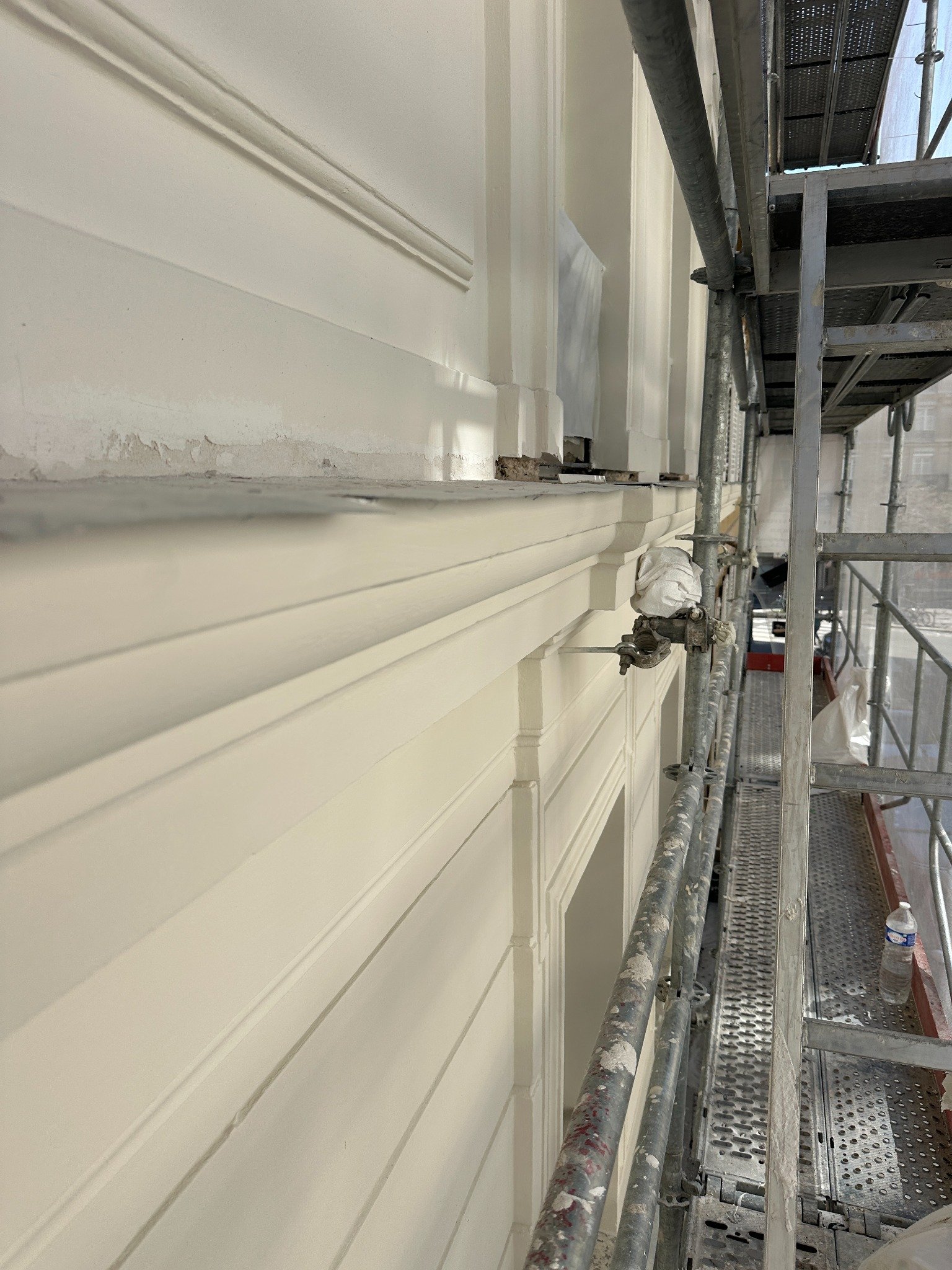 Dès la phase préparatoire, les échafaudages ont été montés en toute sécurité, permettant d’accéder à l’ensemble des niveaux. La façade présentait d’importantes dégradations et un encrassement généralisé.
