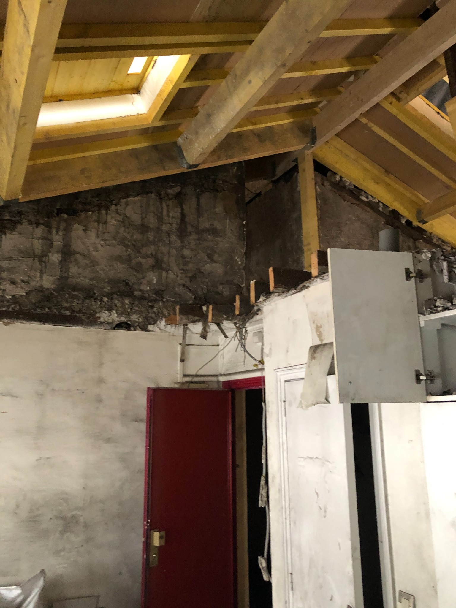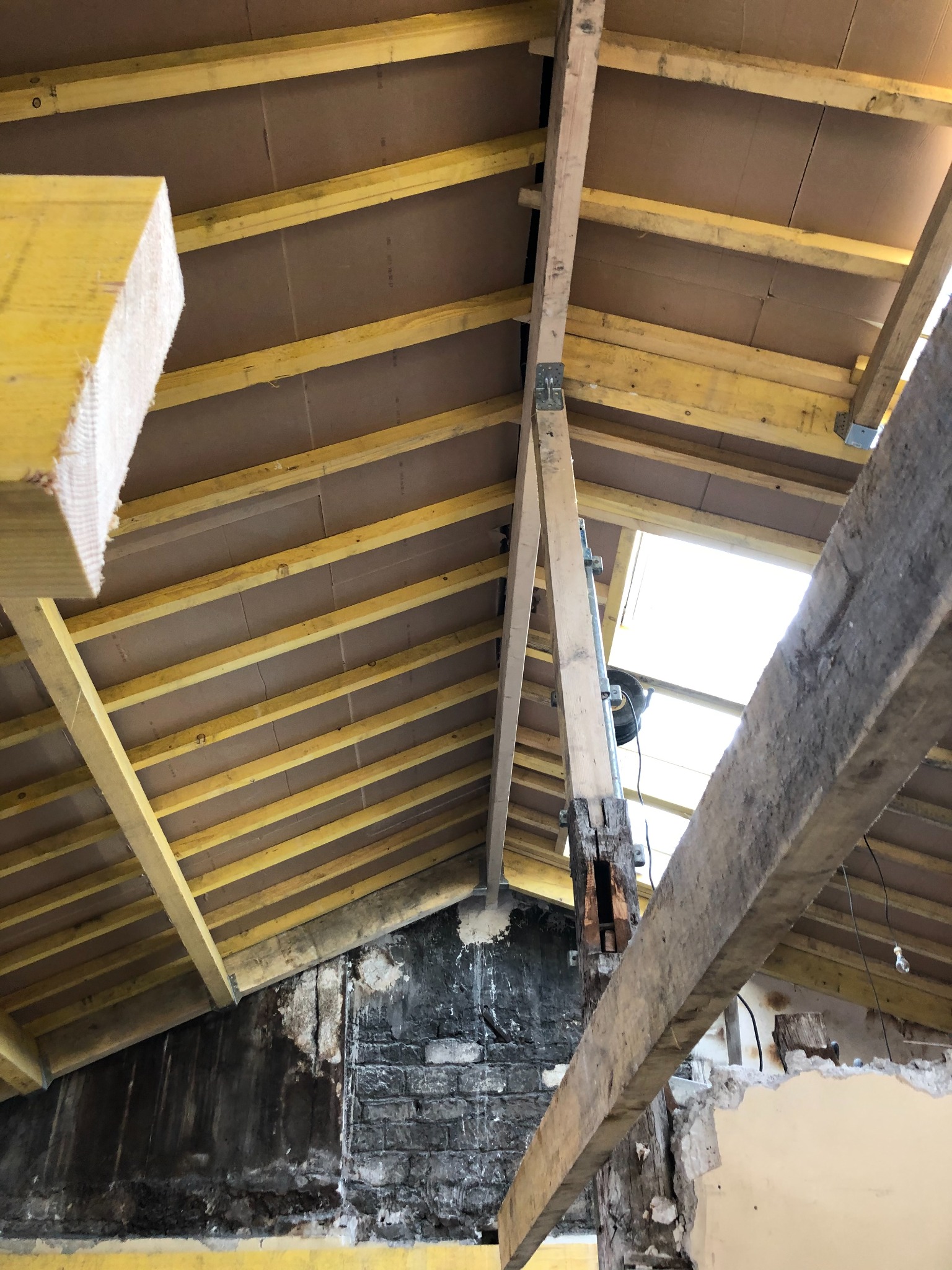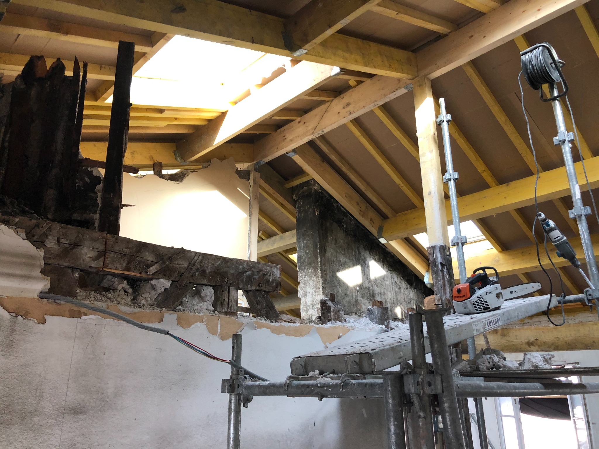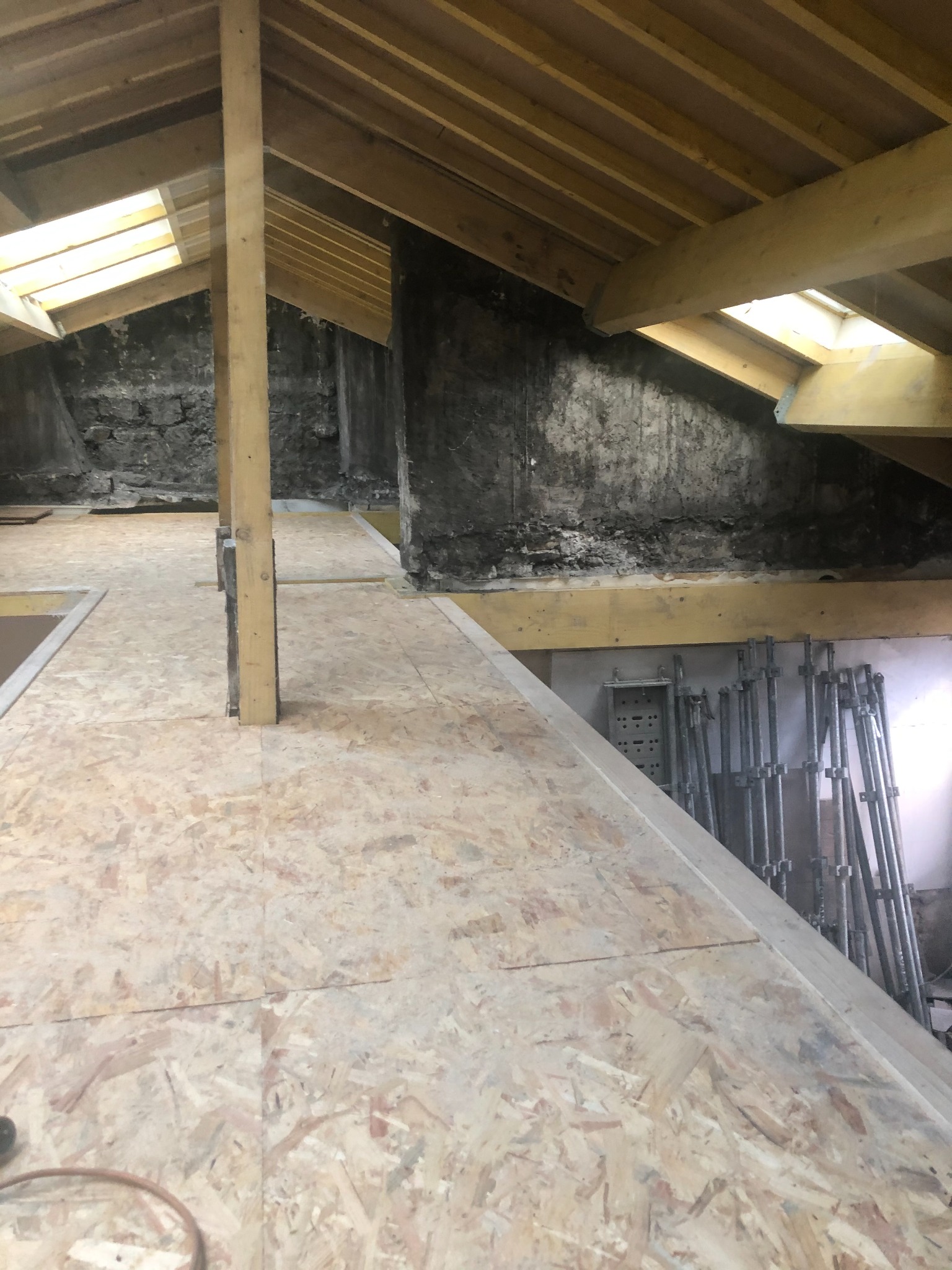 Les travaux ont débuté par une phase de démolition importante et un désencombrement complet. La charpente a ensuite été renforcée et une nouvelle couverture zinc à joints debout a été posée avec intégration de plusieurs fenêtres de toit, apportant une lumière naturelle généreuse.