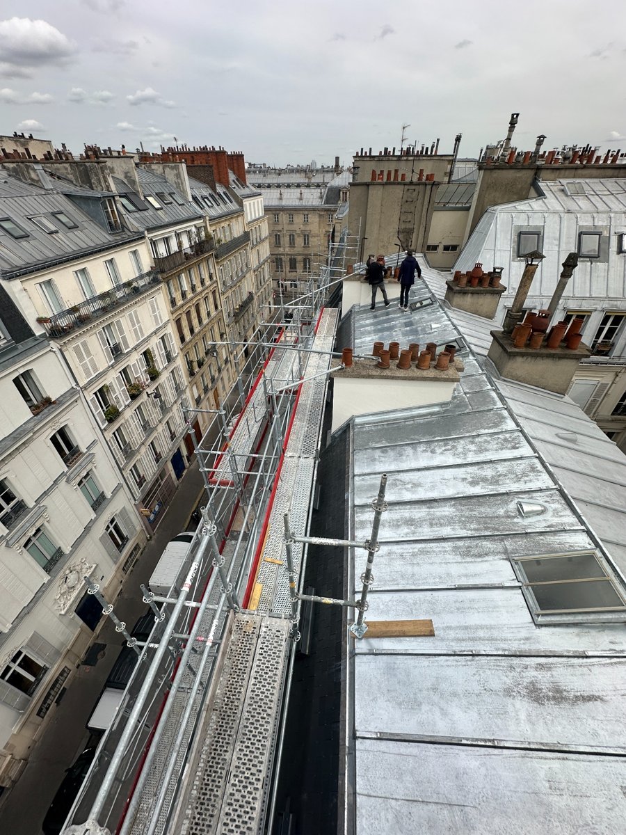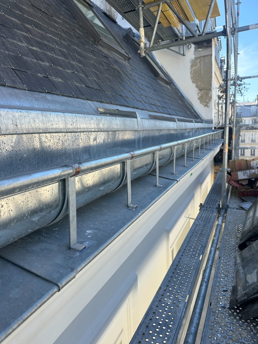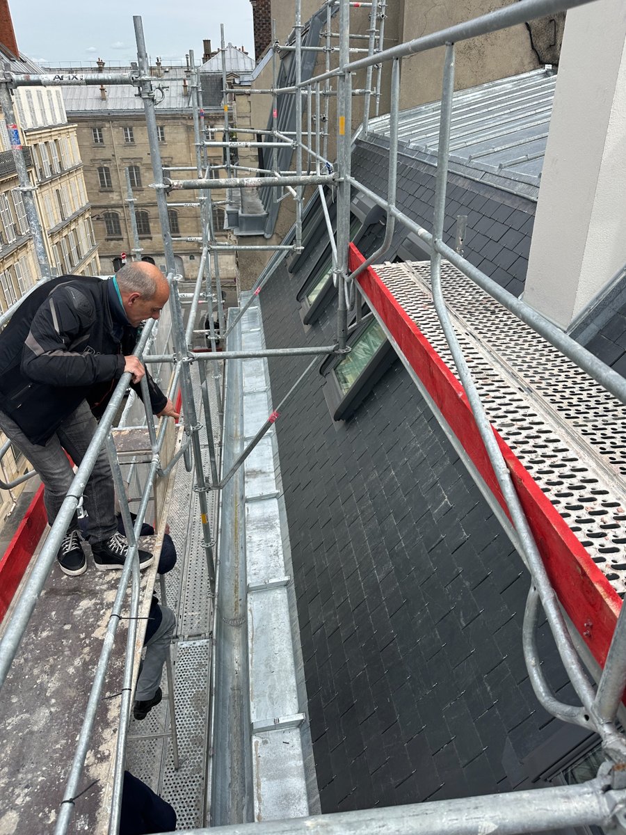 Une attention particulière a été portée à l’alignement des ardoises ainsi qu’à la finition des ouvrages en zinc, assurant une durabilité optimale tout en conservant le cachet architectural de l’immeuble haussmannien.
