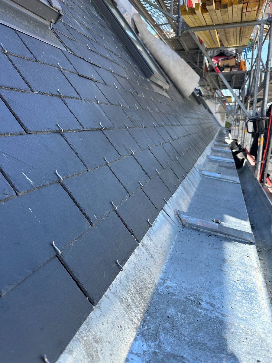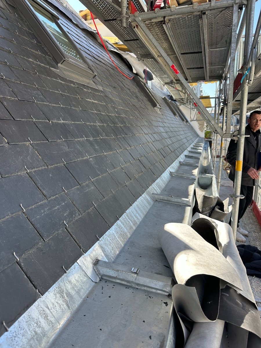 L’intervention s’est déroulée en plusieurs étapes clés : démontage de la couverture existante, mise en place d’un nouveau voligeage, pose d’ardoises neuves au crochet inox, et habillage des noues et chéneaux en zinc naturel. L’ensemble du chantier a été sécurisé par un échafaudage périphérique respectant les normes en vigueur.