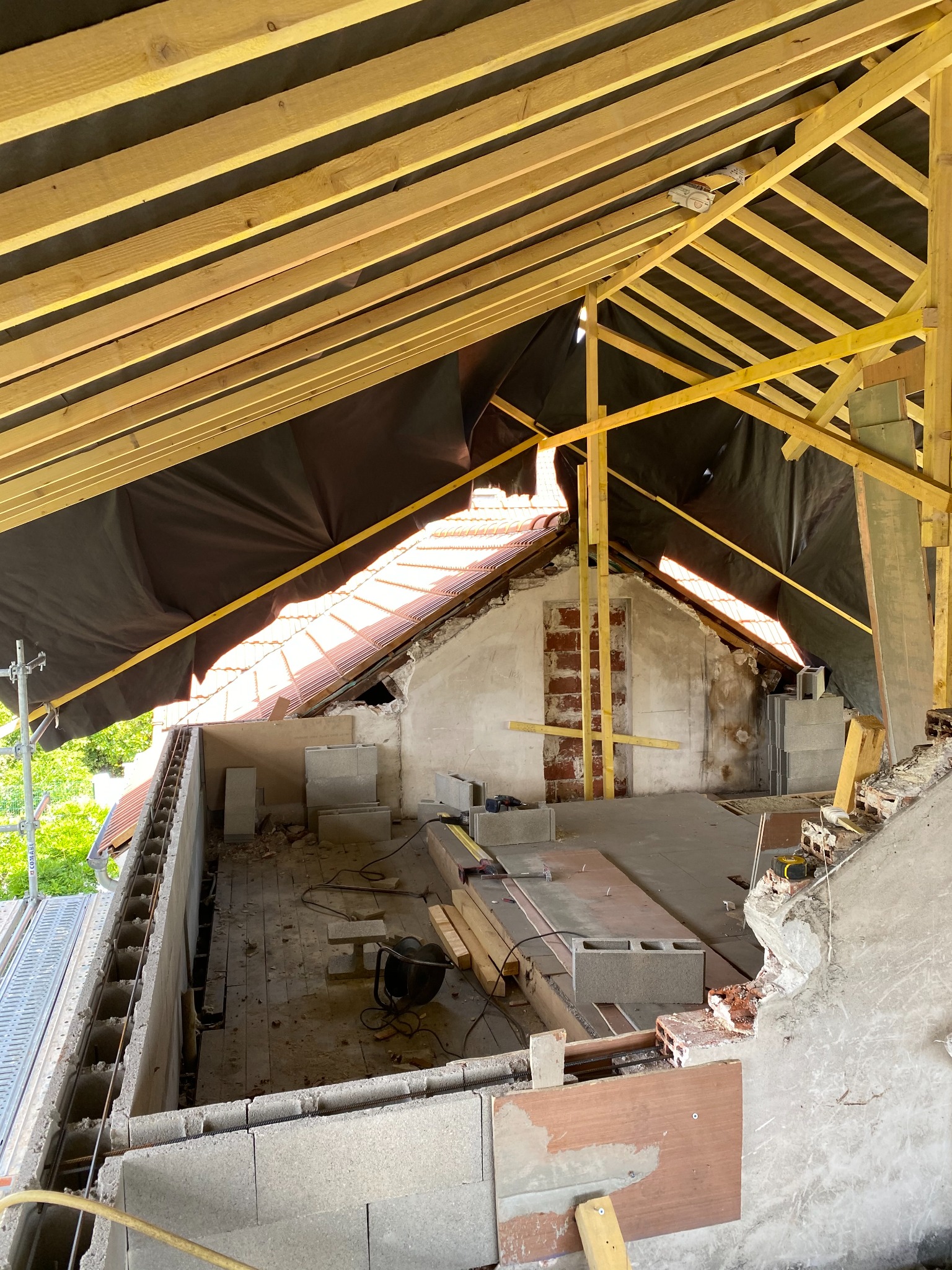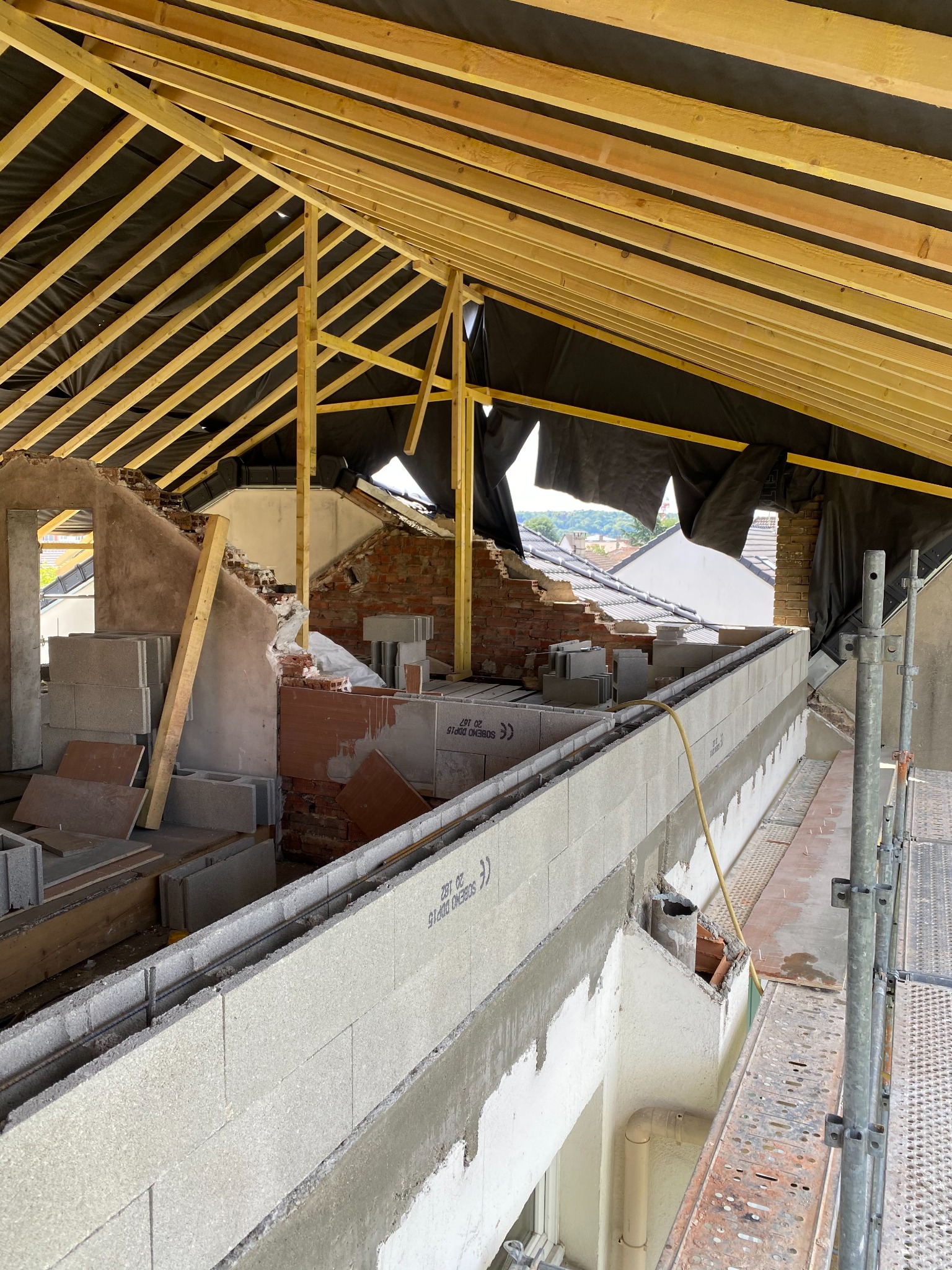 L’intervention a débuté par la dépose de l’ancienne couverture ainsi que la démolition partielle de la charpente existante. Une nouvelle structure bois a été mise en place afin de créer un nouvel étage habitable.