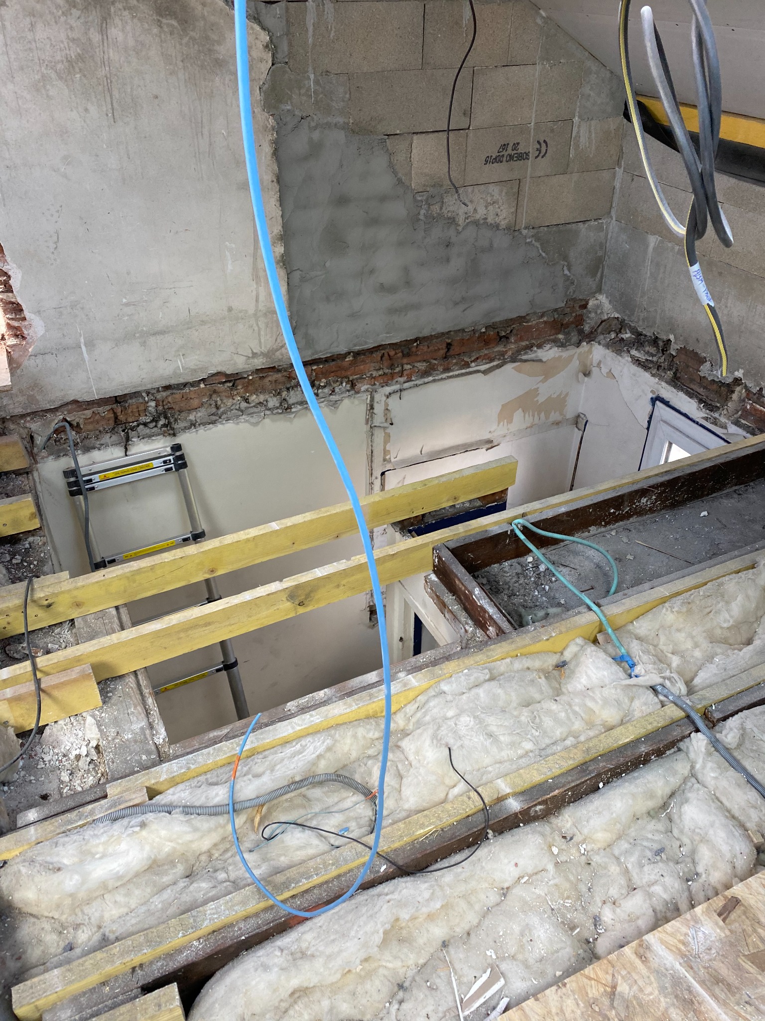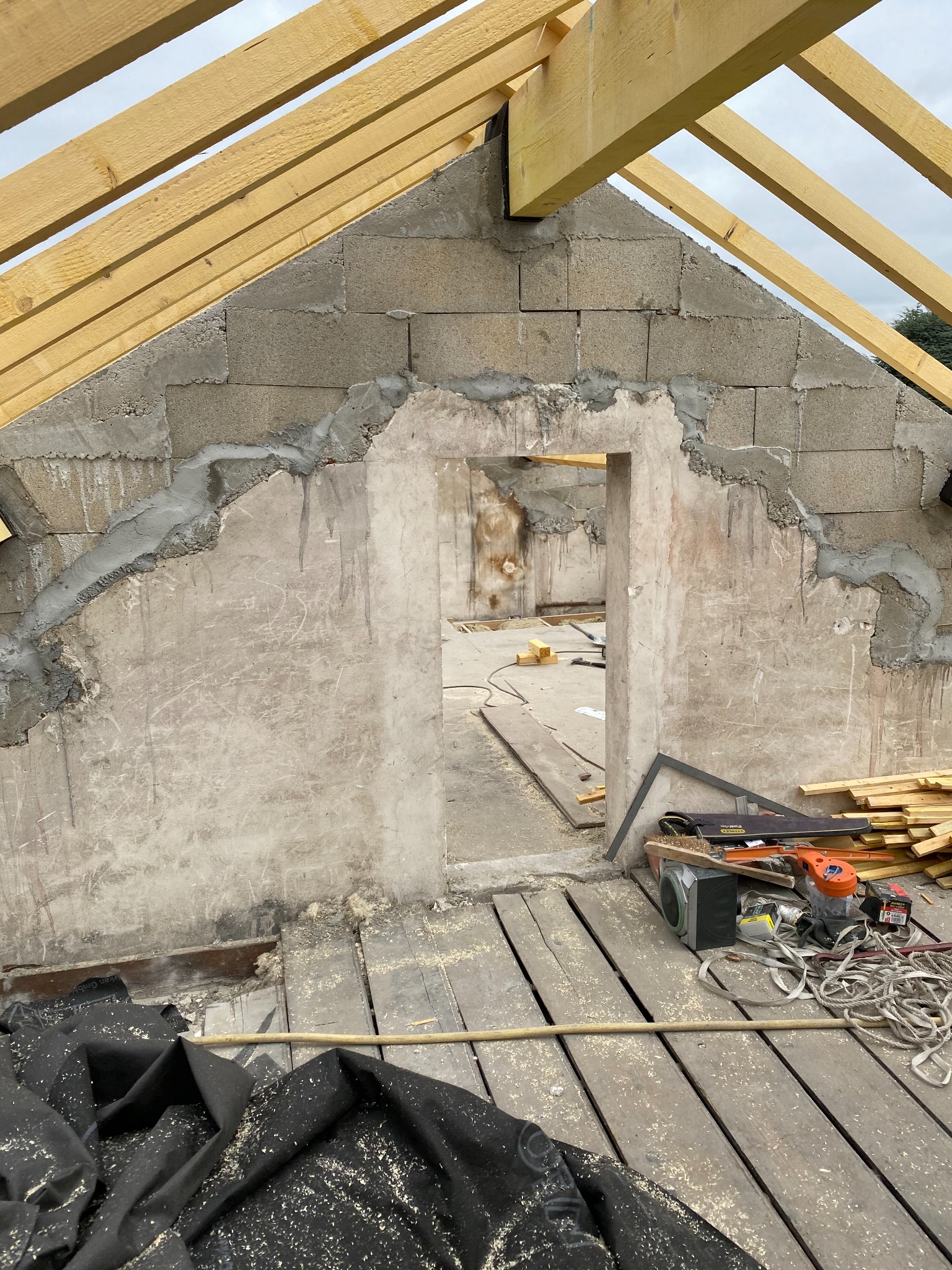La couverture a été refaite à neuf avec des tuiles en terre cuite et une finition soignée sur les rives et faîtages. En intérieur, l’étage nouvellement créé a été cloisonné et doublé, avec passage des gaines électriques et réseaux, puis habillé de plaques de plâtre et préparé pour les finitions.