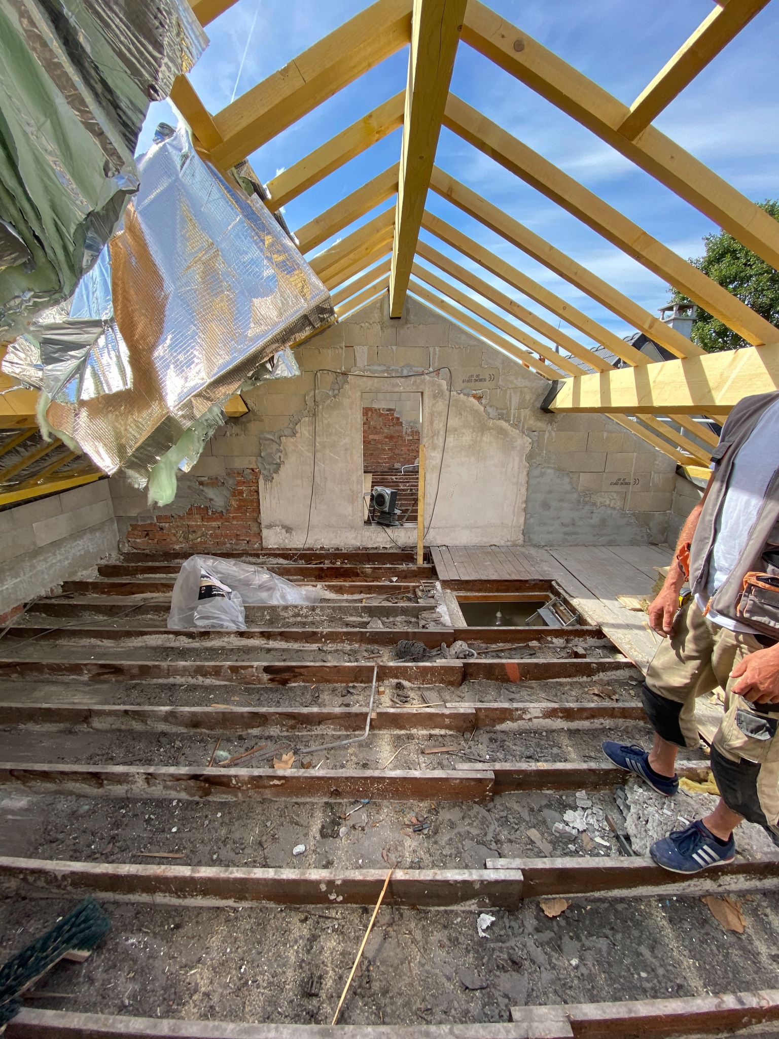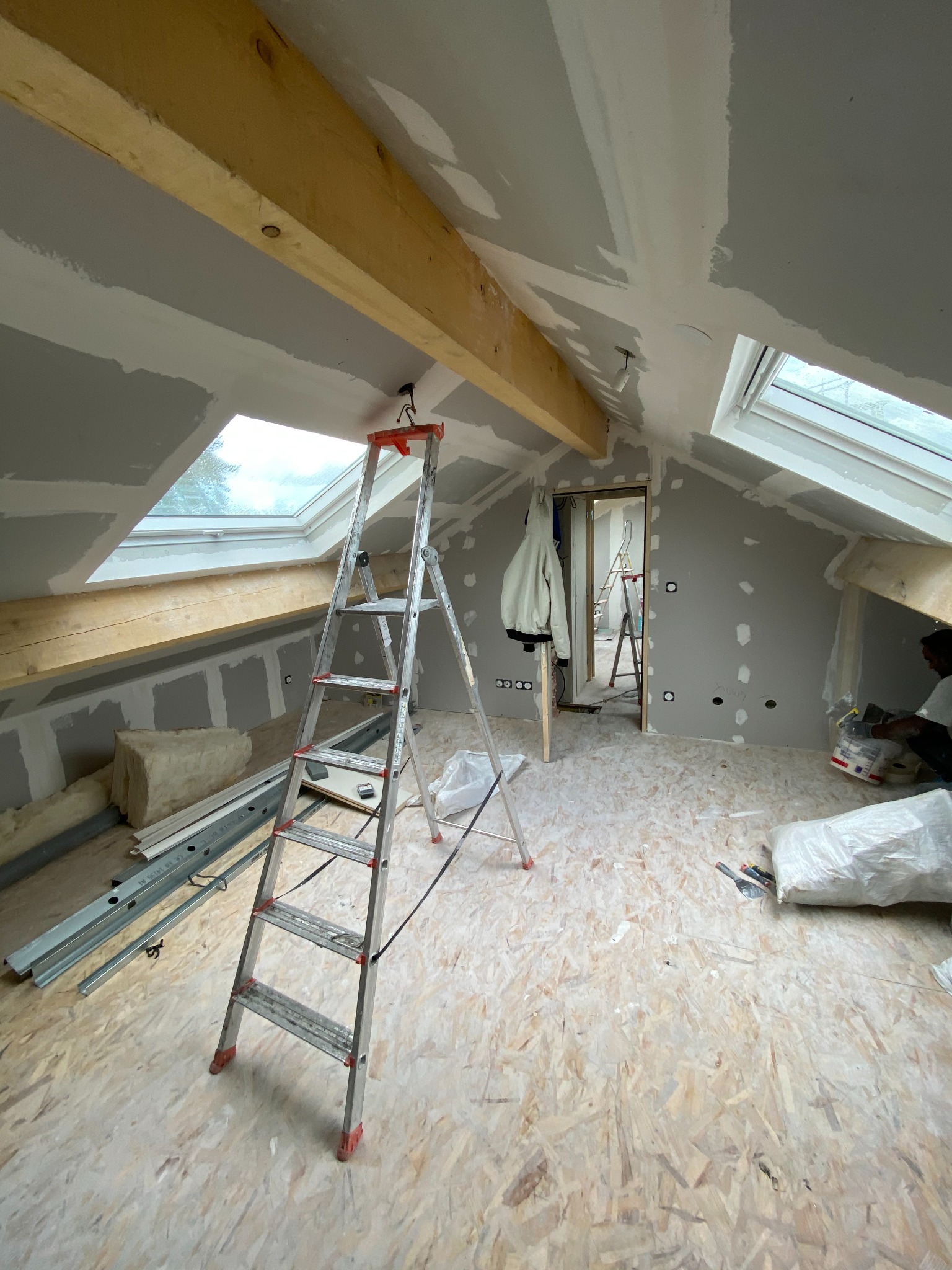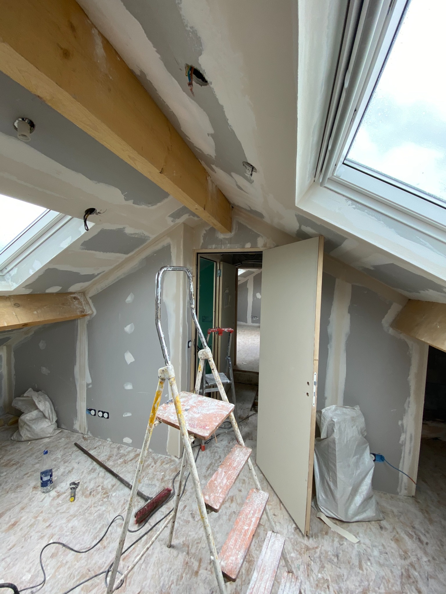 La nouvelle charpente a été assemblée sur site avec des poutres apparentes et un renforcement des murs porteurs. L’isolation des rampants a été réalisée pour assurer un confort thermique optimal, suivie de la pose des fenêtres de toit permettant une belle luminosité naturelle.