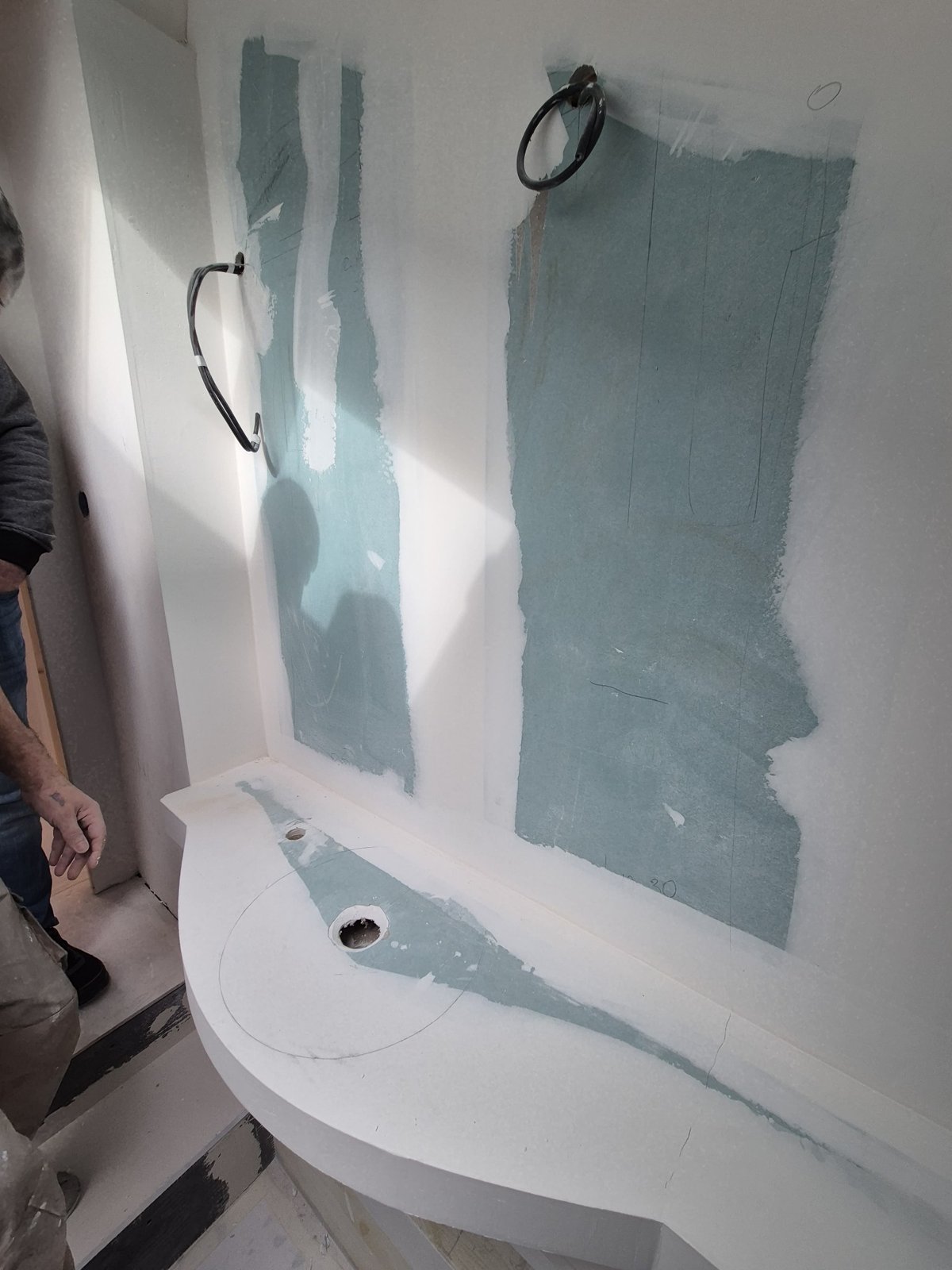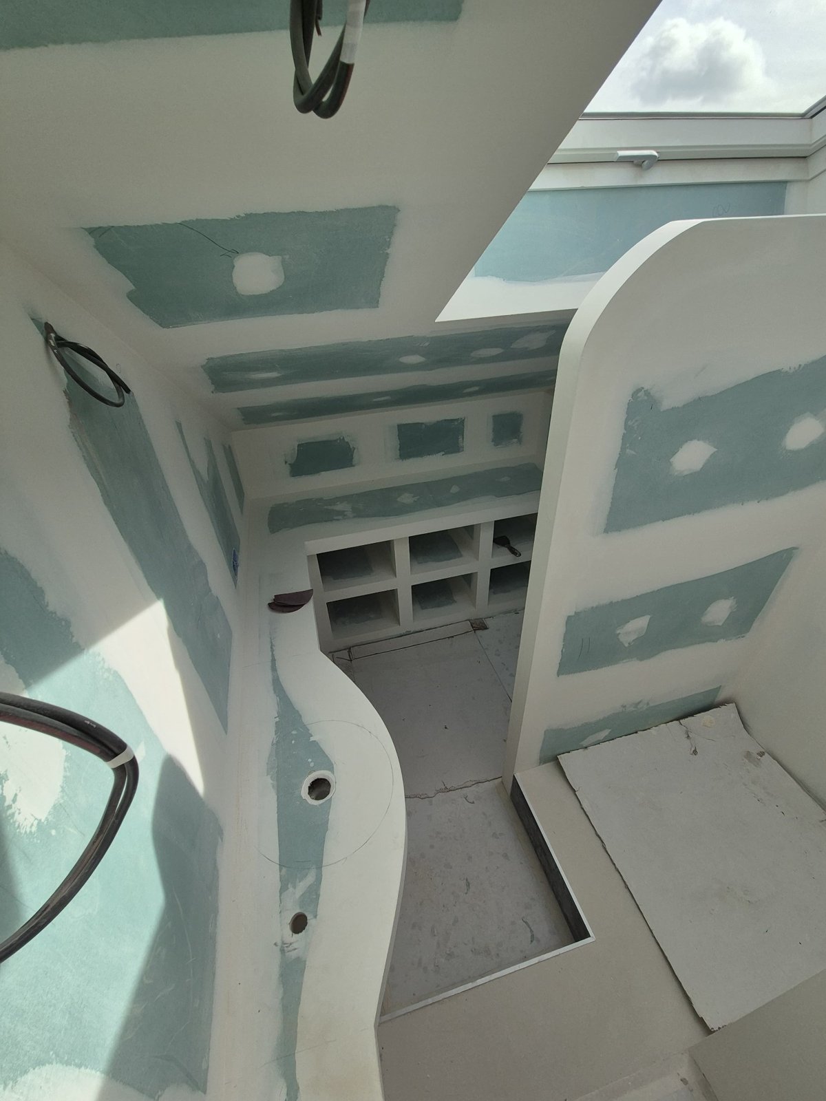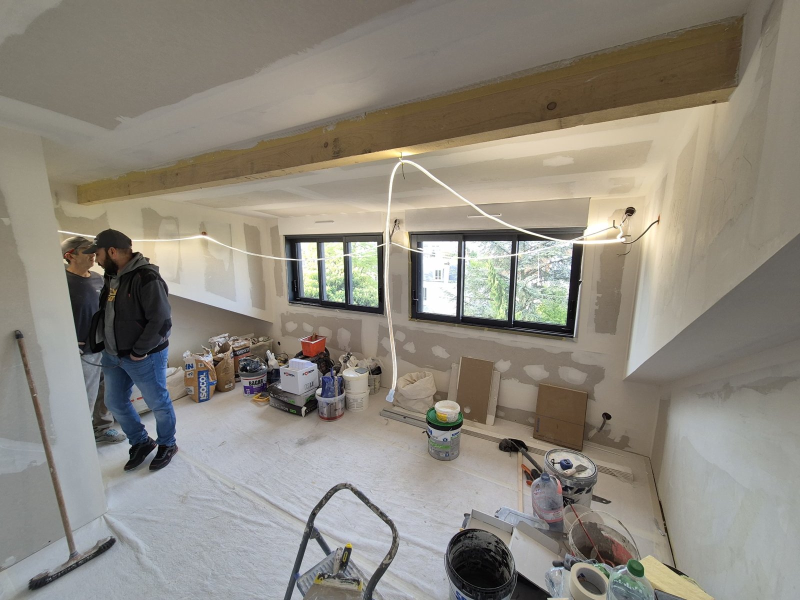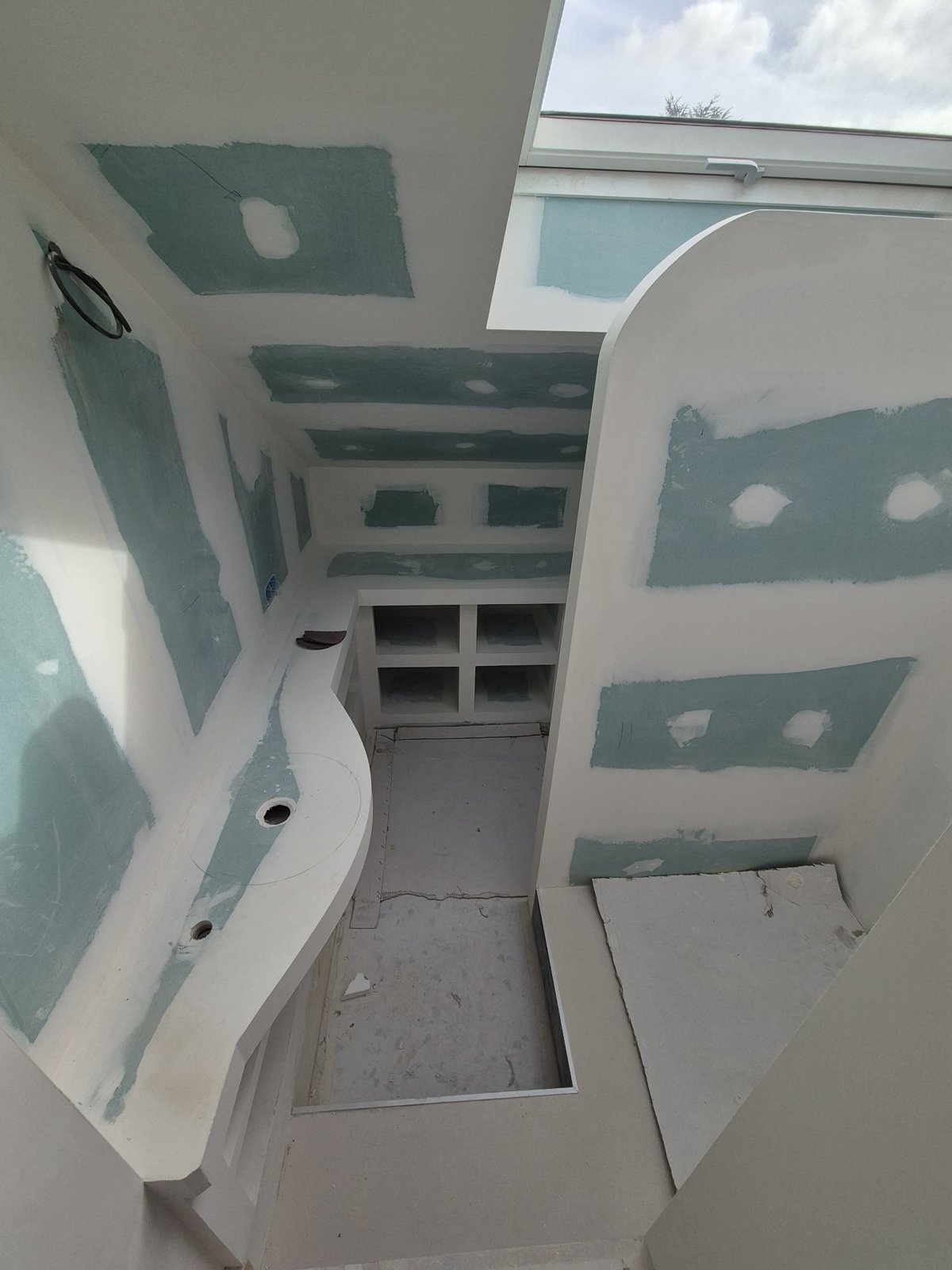Le travail du placoplâtre a été réalisé sur mesure, avec des formes arrondies, des niches et un plan vasque en cours d’installation. Grâce à ce projet, la maison gagne en volume, en confort et en valeur, tout en conservant son charme d’origine.