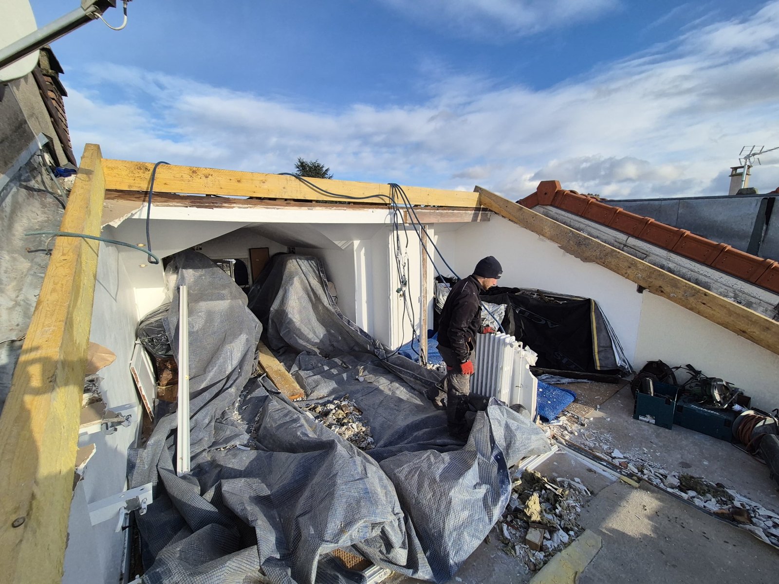 Après la mise en place d’un échafaudage sécurisé, nos équipes ont procédé à la dépose complète de l’ancienne toiture. Une nouvelle ossature a été créée afin de surélever l’ensemble, permettant d’aménager un étage supplémentaire.