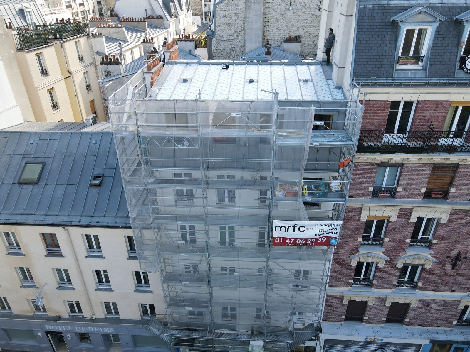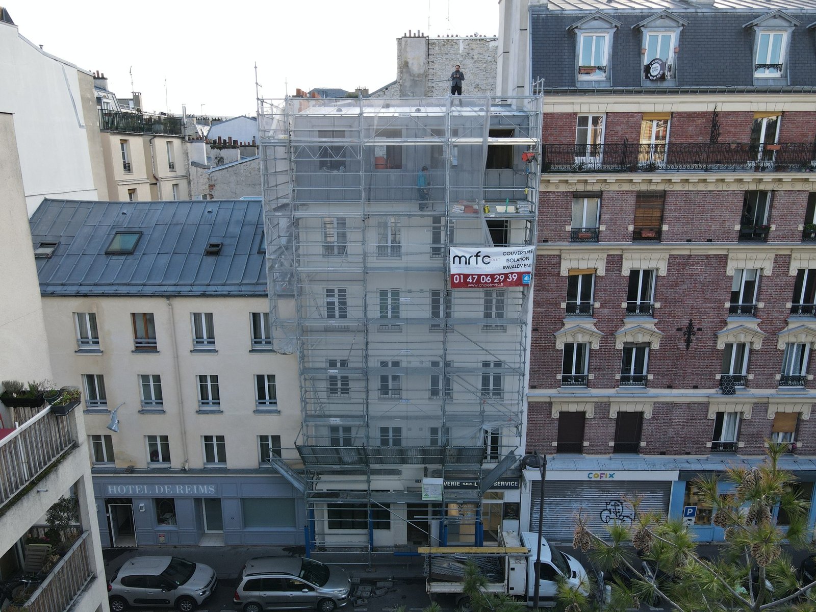 L’ensemble a été réalisé en coordination avec un échafaudage intégral sur rue et une sécurisation complète du site.