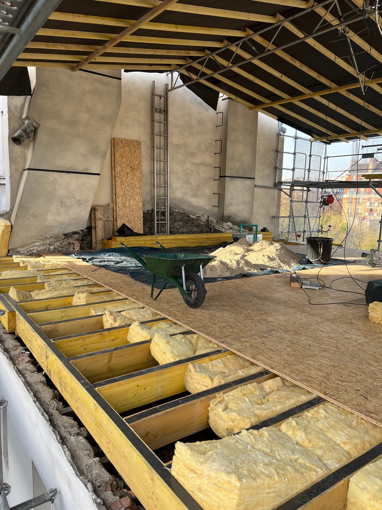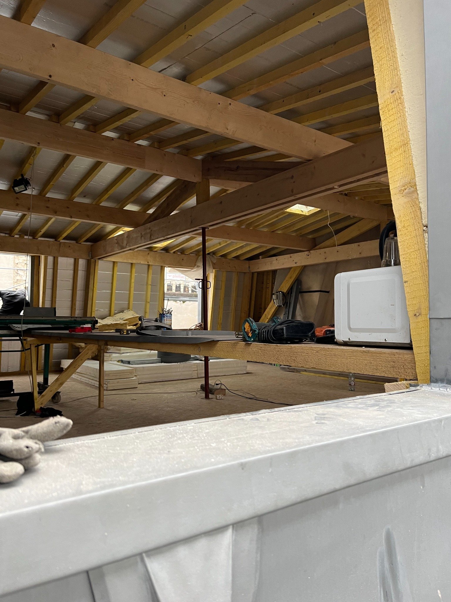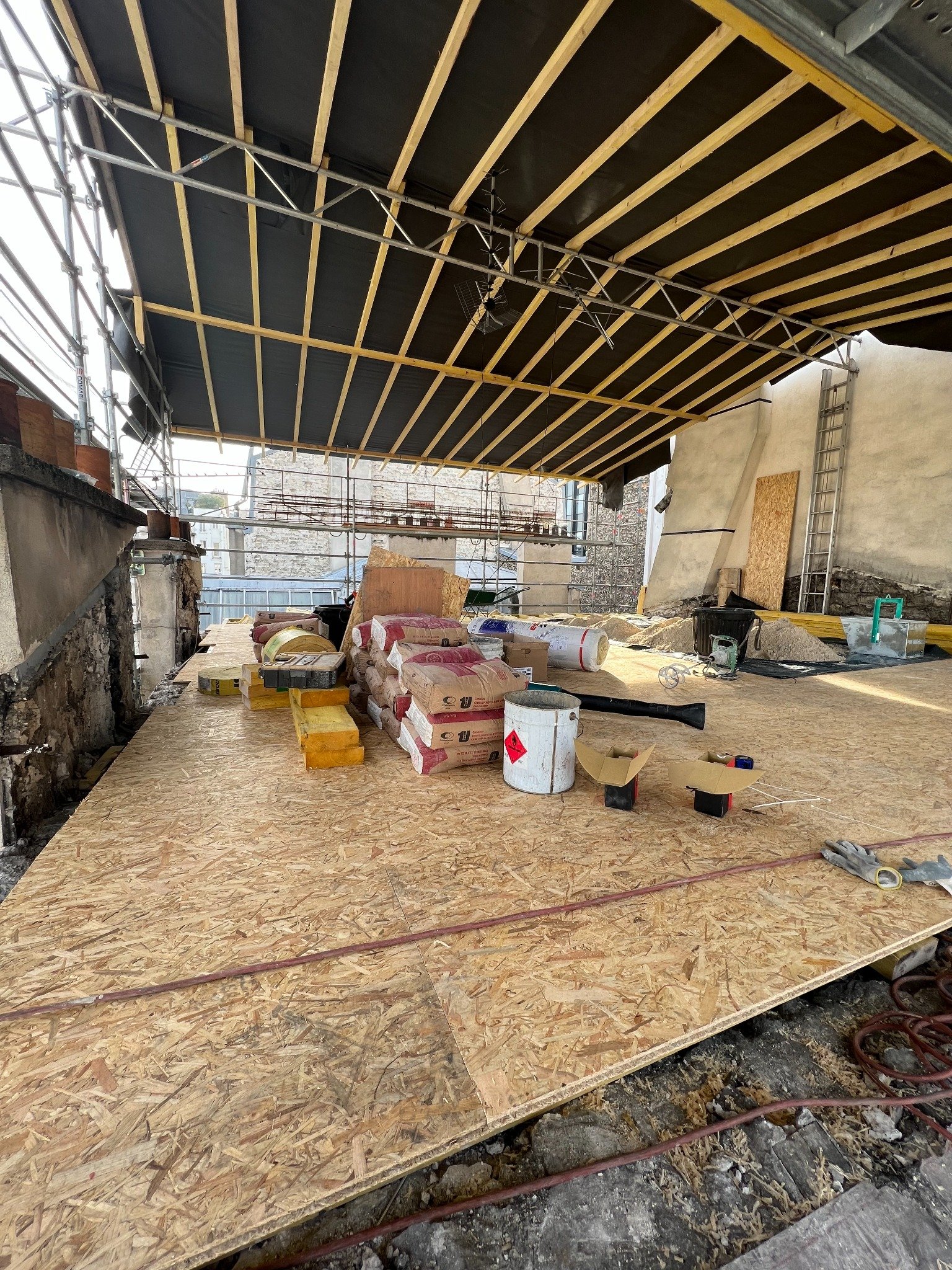 Après la démolition de l’ancien plancher en mauvais état, une nouvelle structure a été mise en place avec des solives bois, une isolation thermique renforcée entre les poutres, puis une dalle en OSB.