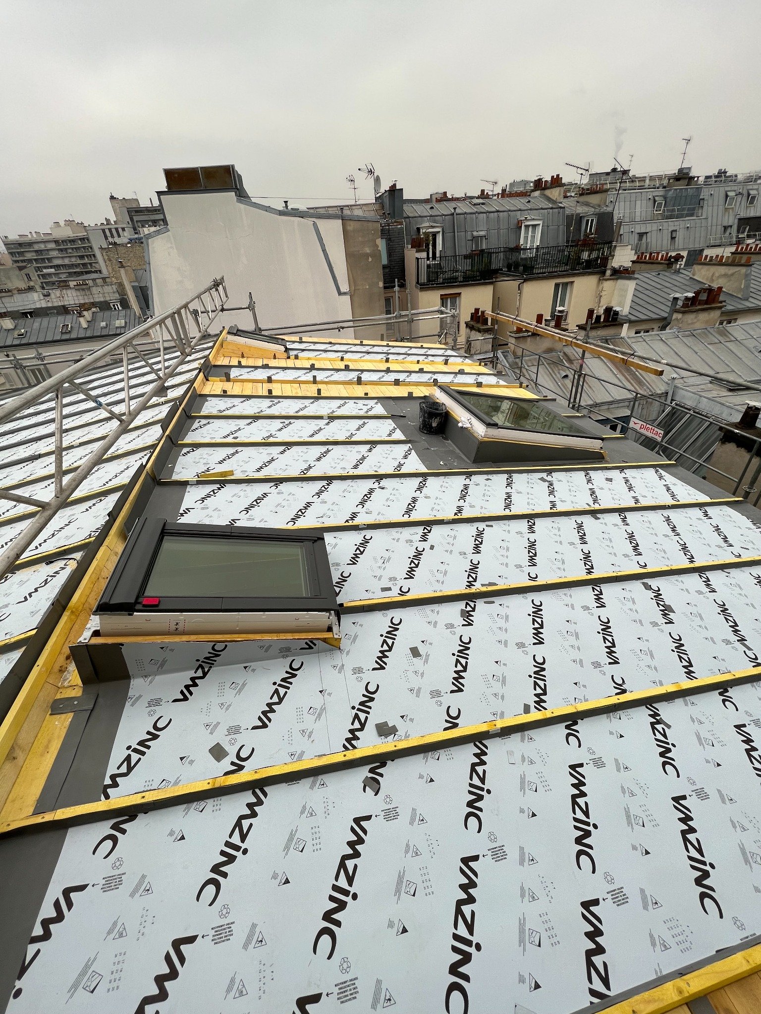 Une charpente sur mesure a été réalisée, accompagnée de la pose d’un écran sous toiture haute performance. La couverture a ensuite été effectuée avec du zinc, garantissant une excellente étanchéité.
