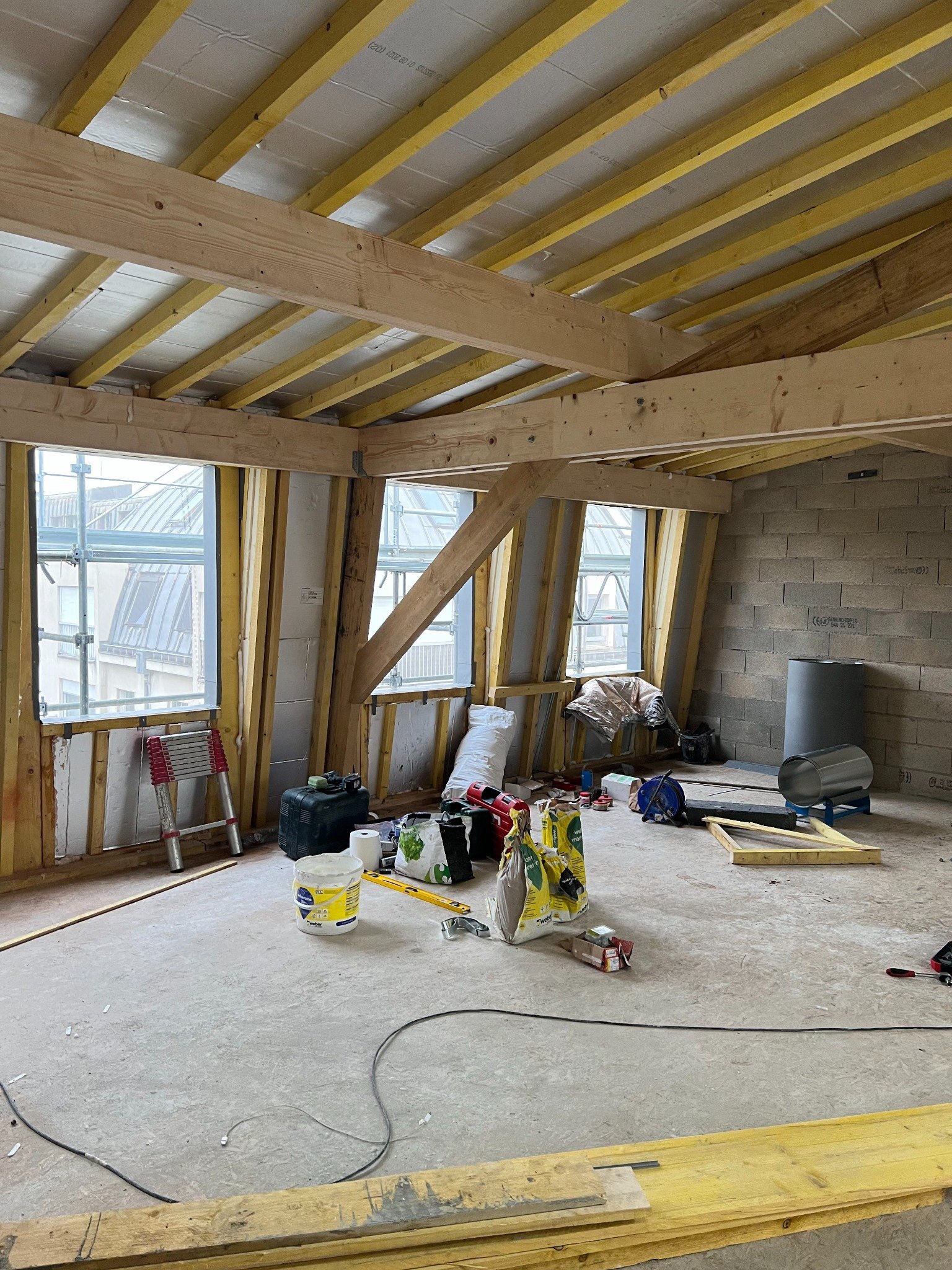 Des fenêtres de toit ont également été intégrées pour apporter un maximum de lumière naturelle. À l’intérieur, des cloisons, des doublages en laine et des menuiseries ont été installés pour créer un nouvel espace de vie conforme aux normes actuelles.